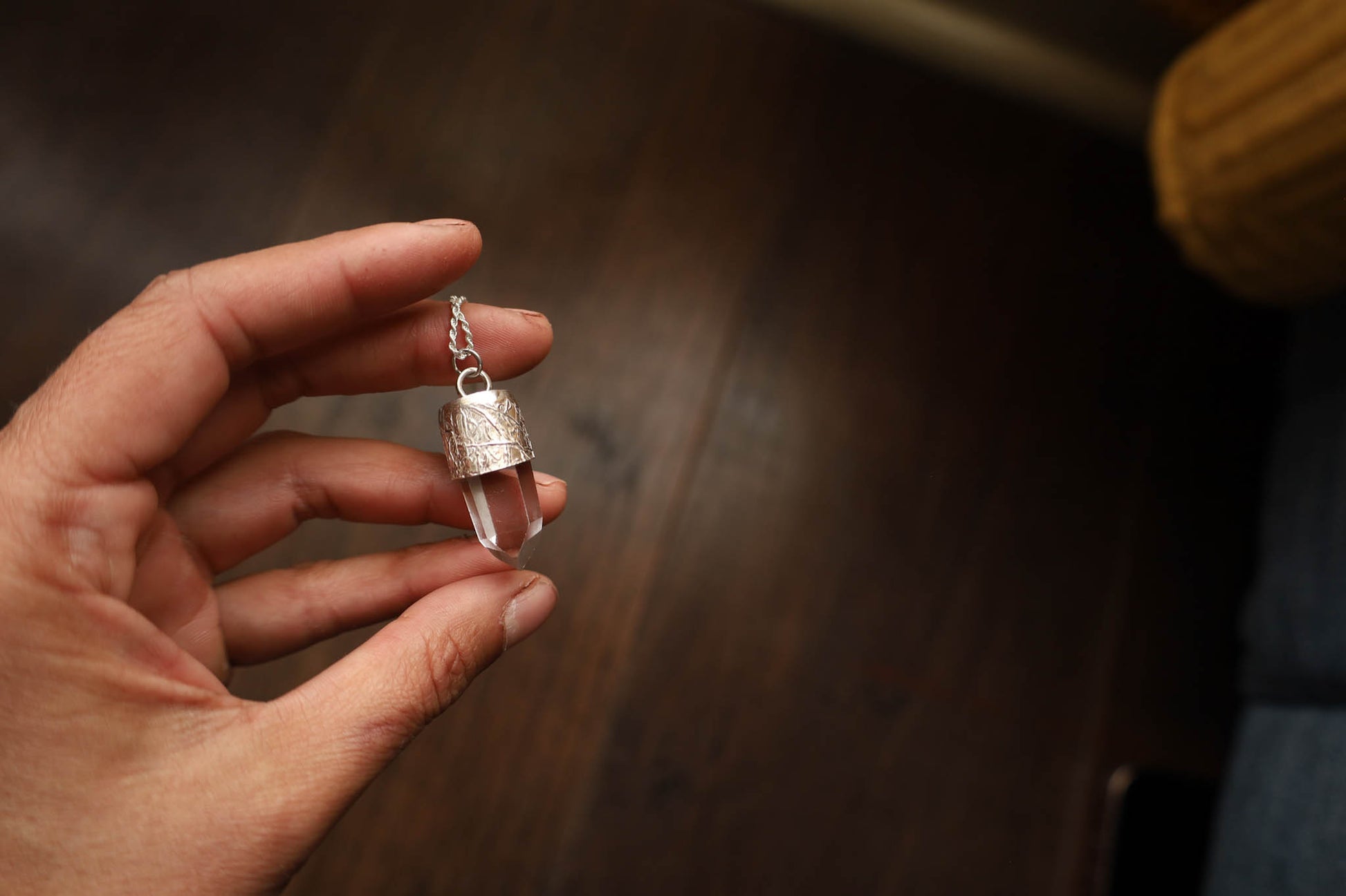 Amuleto de cuarzo cristal hecho a mano en plata 950.