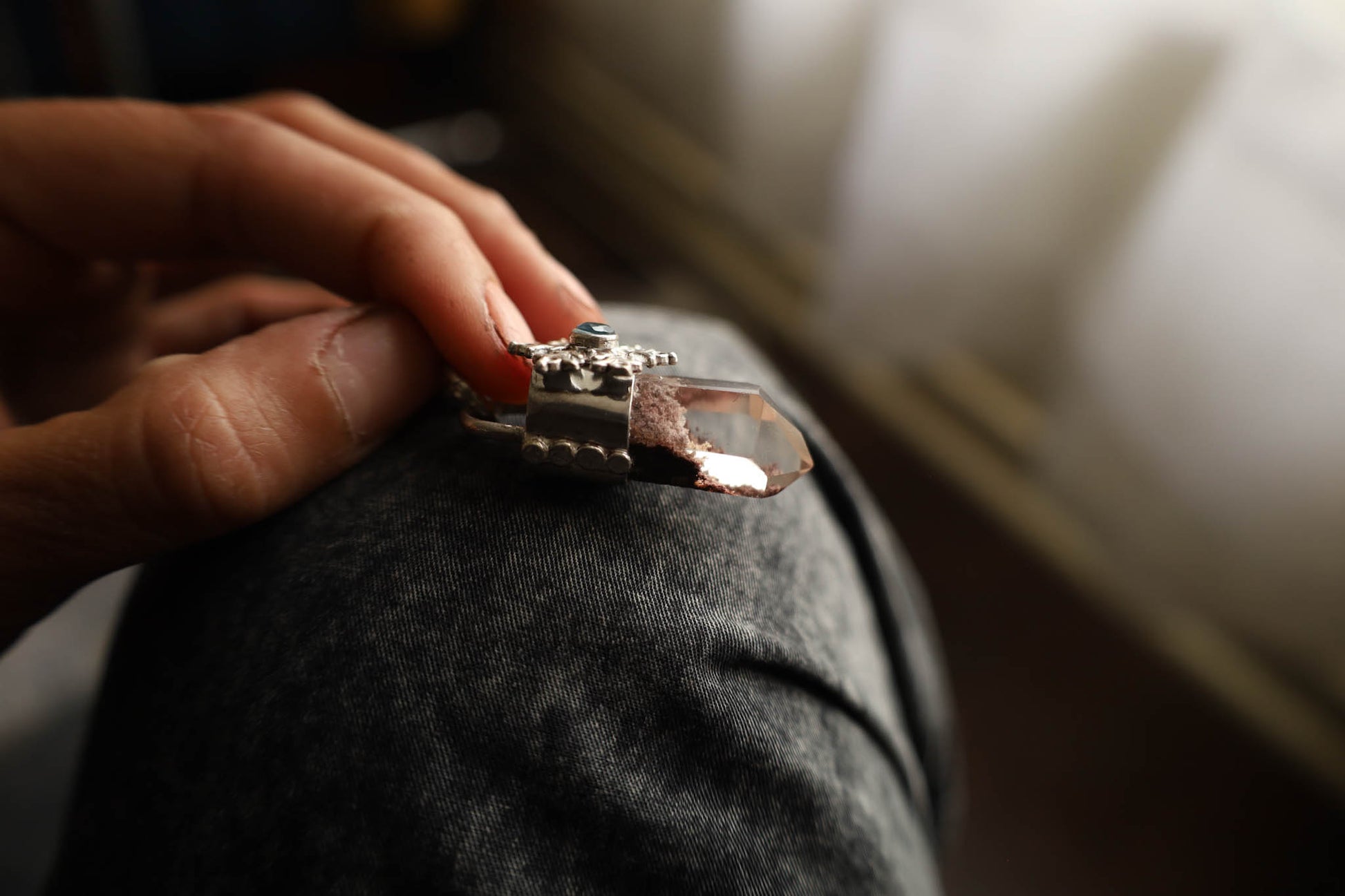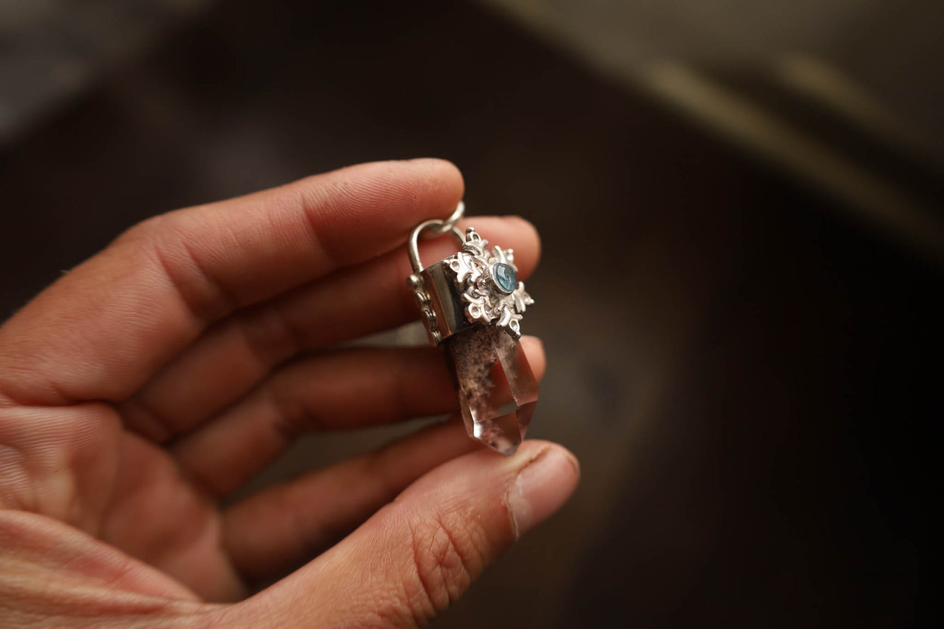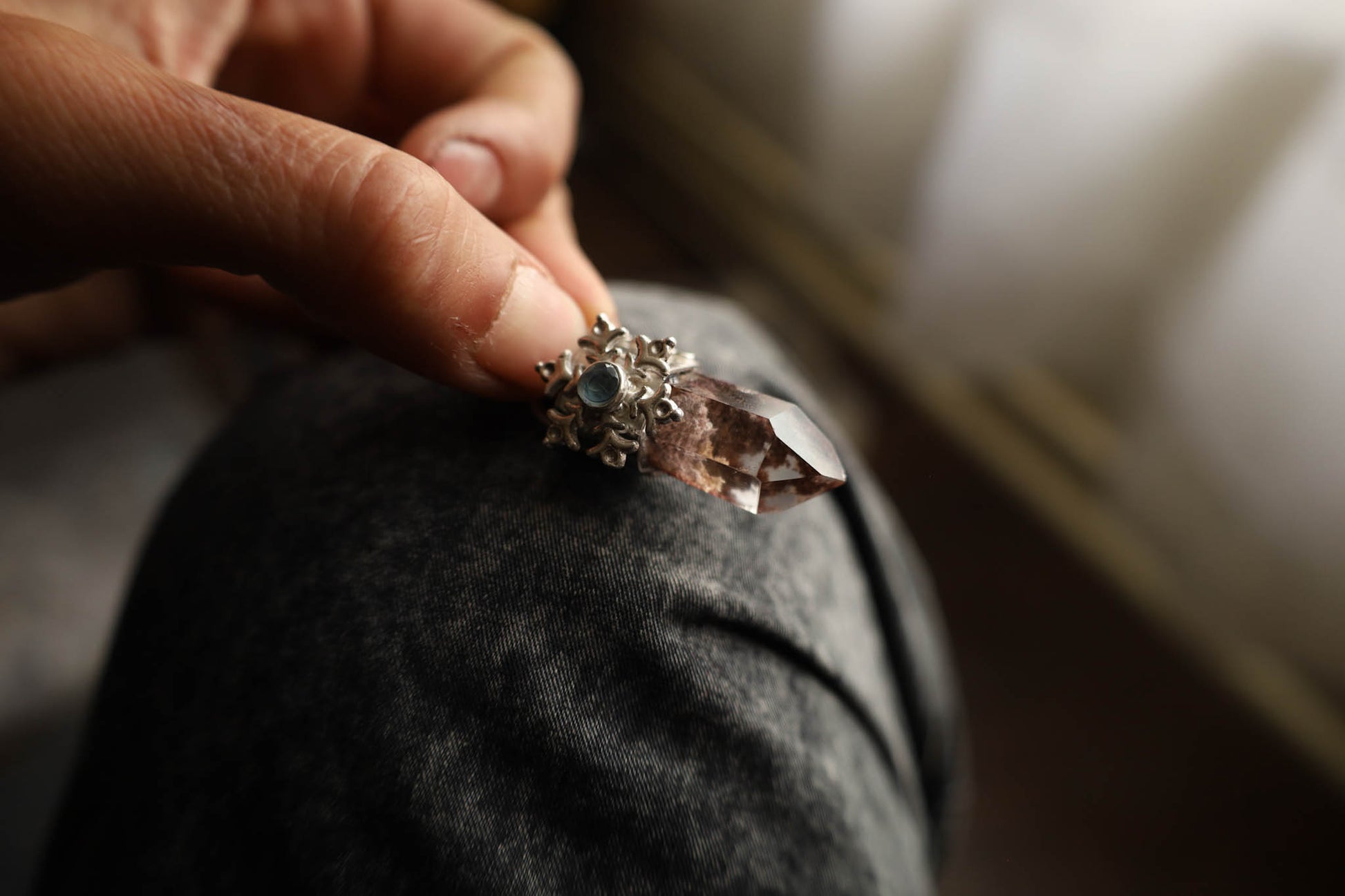 El cuarzo lodolita se asocia a la conexión con la tierra y la introspección, amuleto de protección, mientras que el topacio azul aporta claridad y foco.