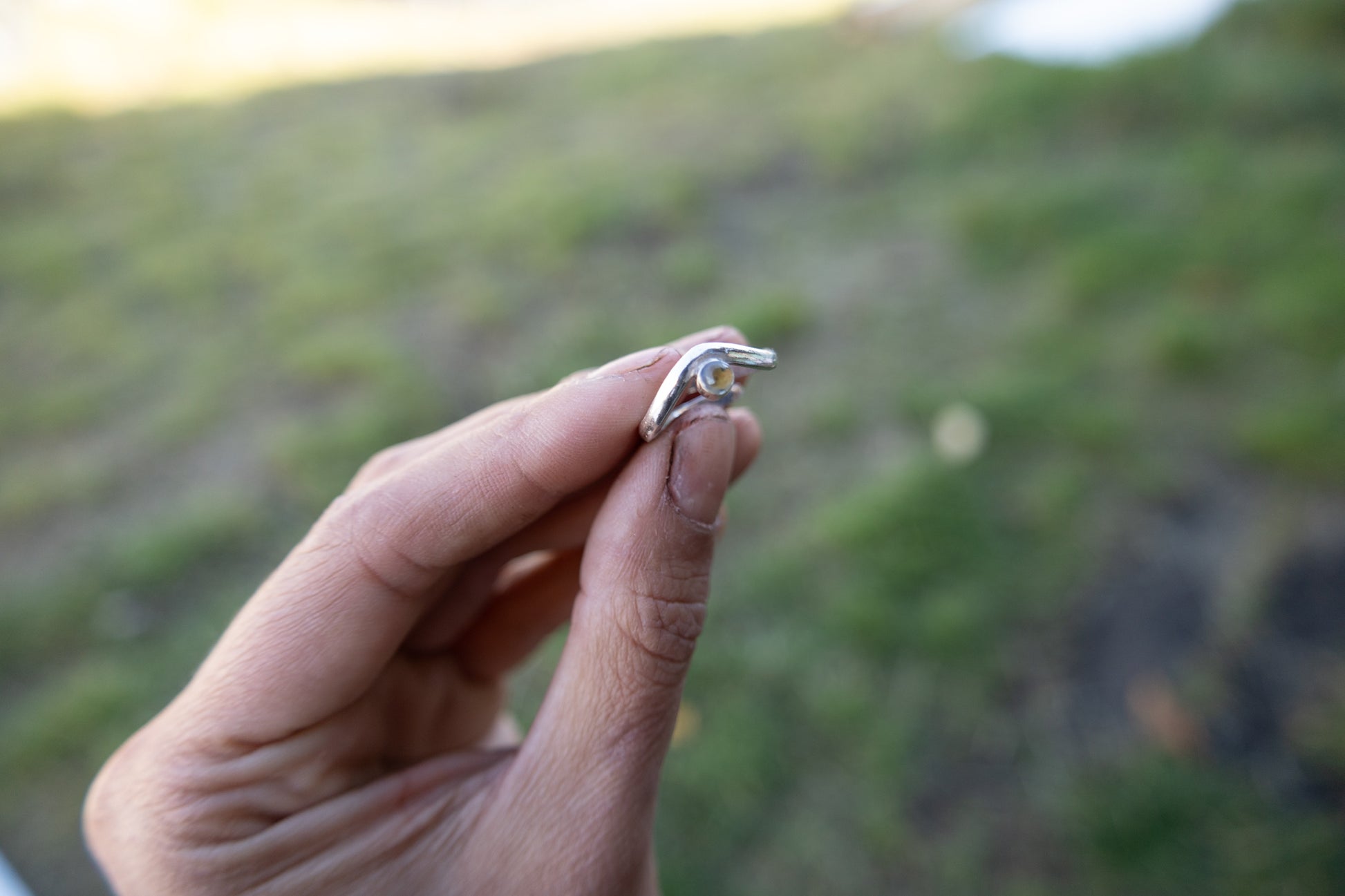 Anillo de plata 950 trabajado a mano, con un diseño que evoca la silueta de una montaña: una V invertida que enmarca con firmeza una piedra central.