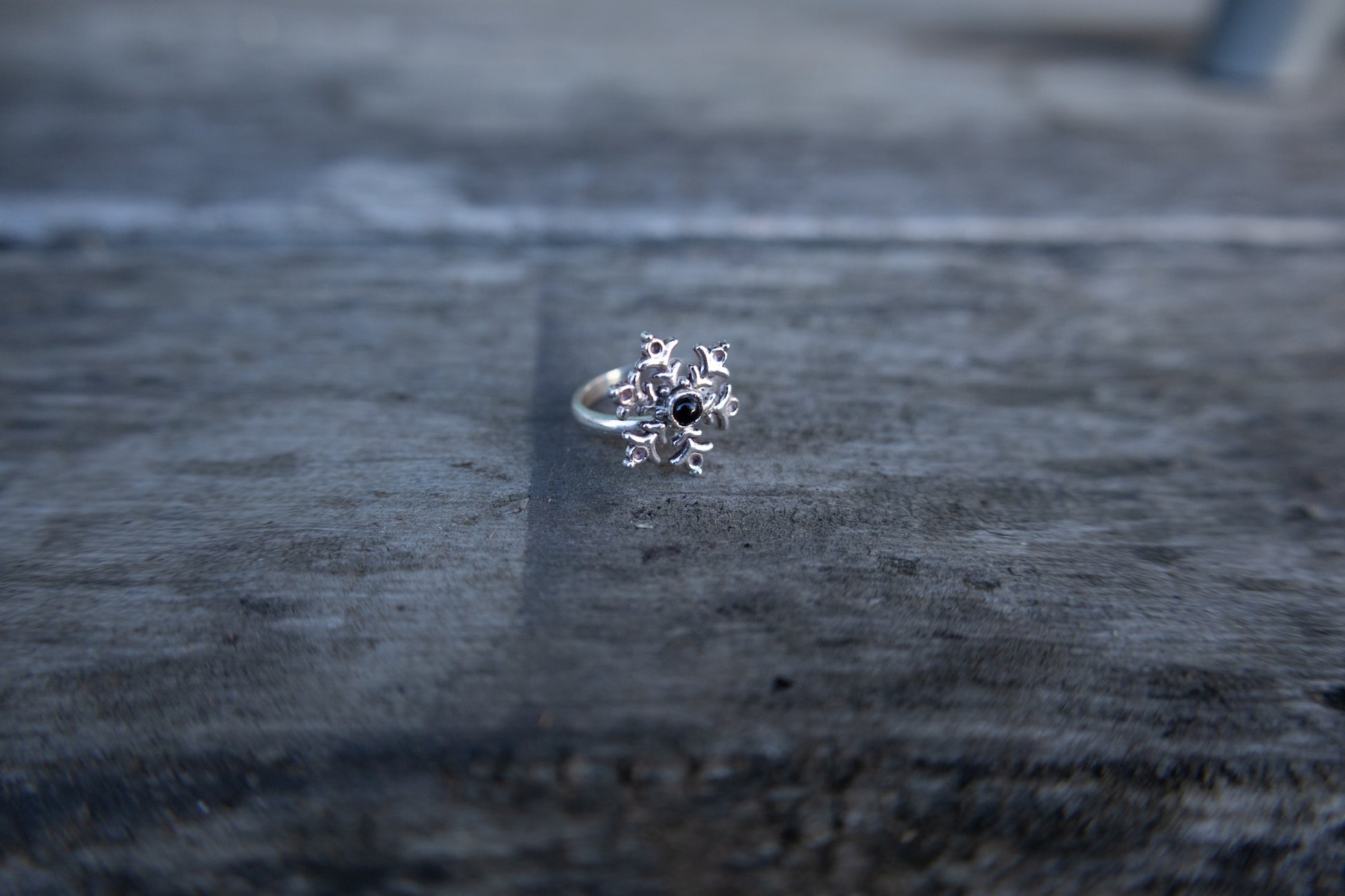 Anillo hecho a mano en plata 950, inspirado en la geometría de los copos de nieve. Su diseño simula formas invernales simples y simétricas, con una piedra natural al centro que varía según la pieza: amatista, onix, cuarzo rosado, labradorita o piedra luna.