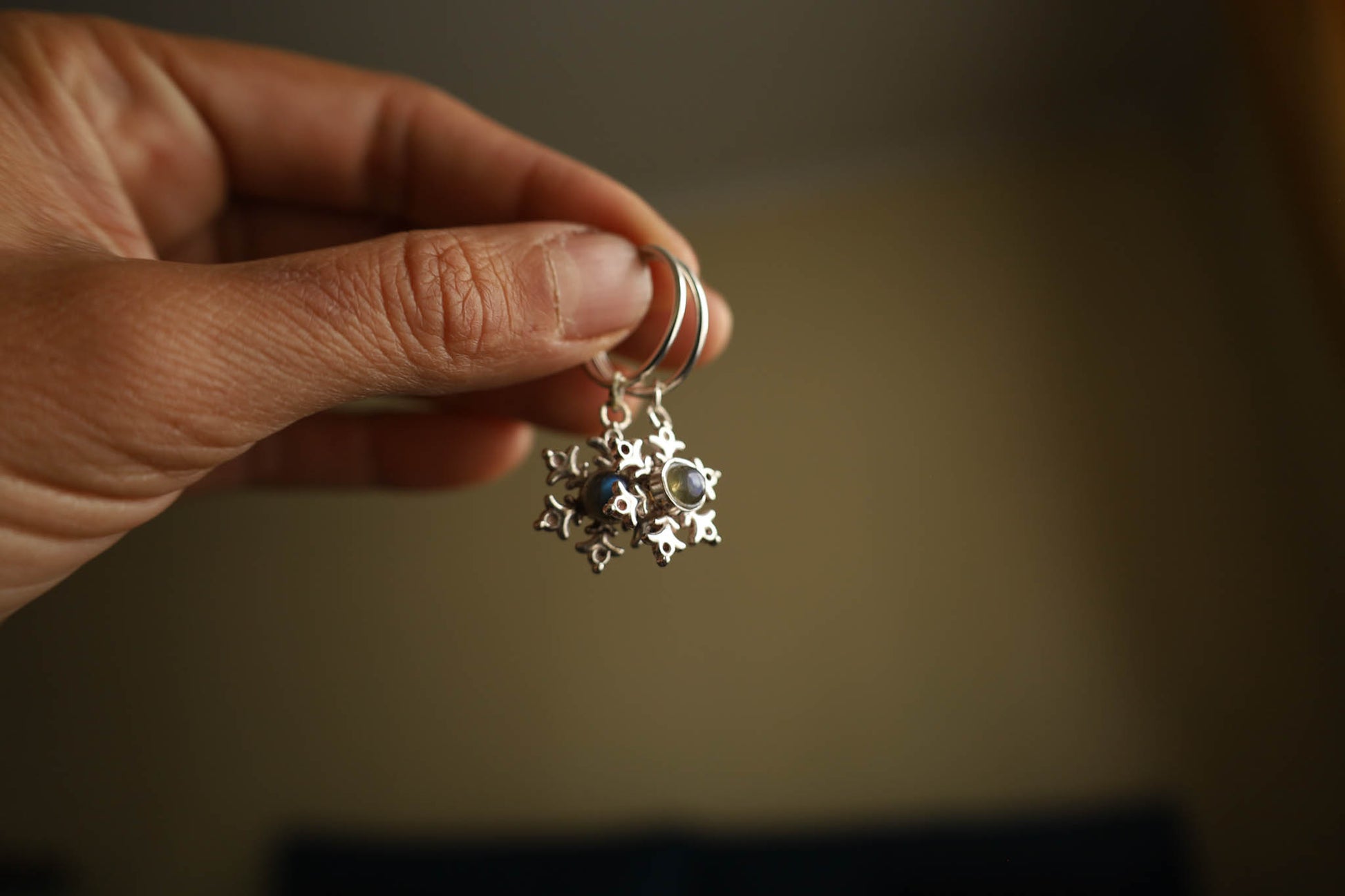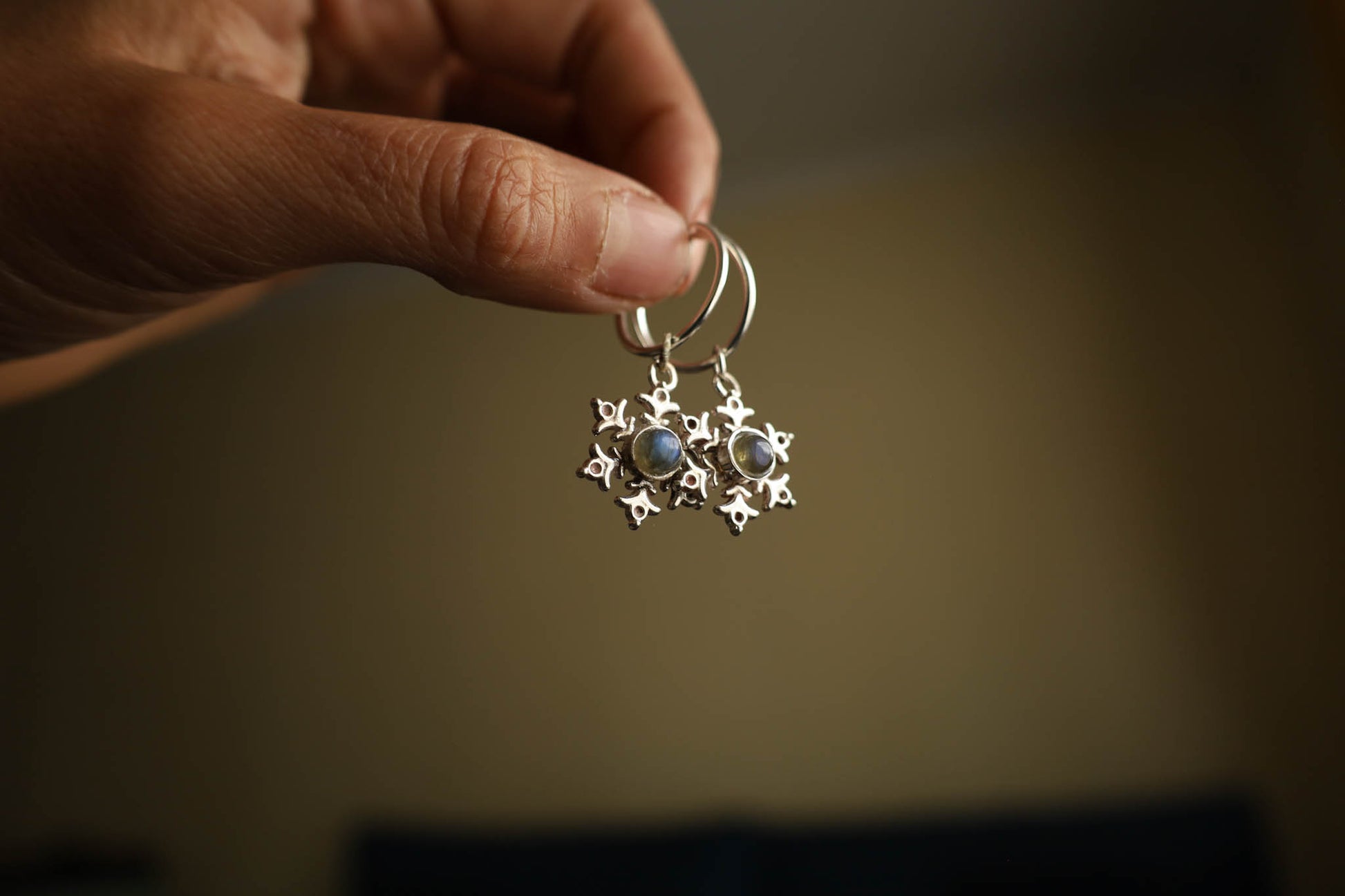 Argollas con detalles de copos de nieve y pequeñas labradoritas engastadas.
